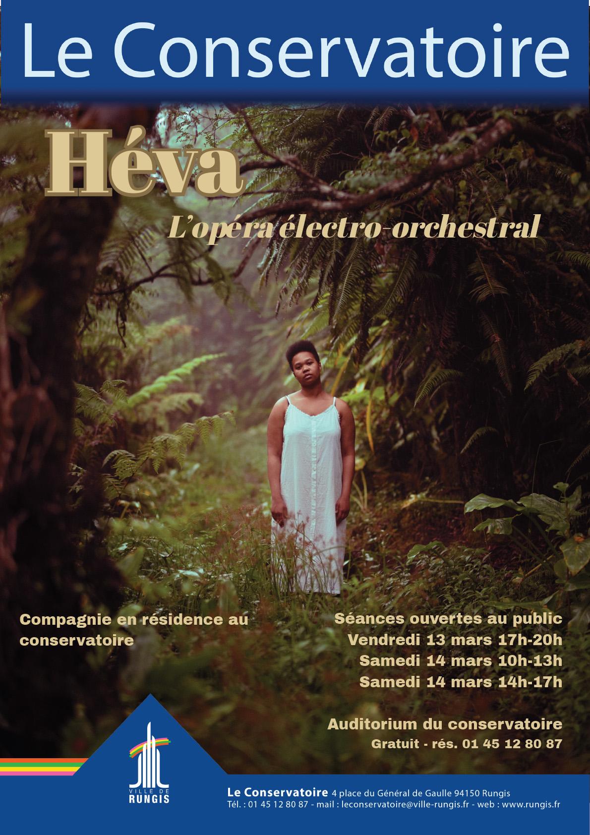 Le conservatoire accueille, au mois de mars, une compagnie d'artistes qui s'installe en résidence afin de finaliser la création de "Héva", un opéra novateur qui unit musique orchestrale, musique électronique, percussions maloya, chant lyrique et théâtre. La compagnie propose trois séances ouvertes au public à l'auditorium du conservatoire avant le grand concert au Théâtre du Châtelet.